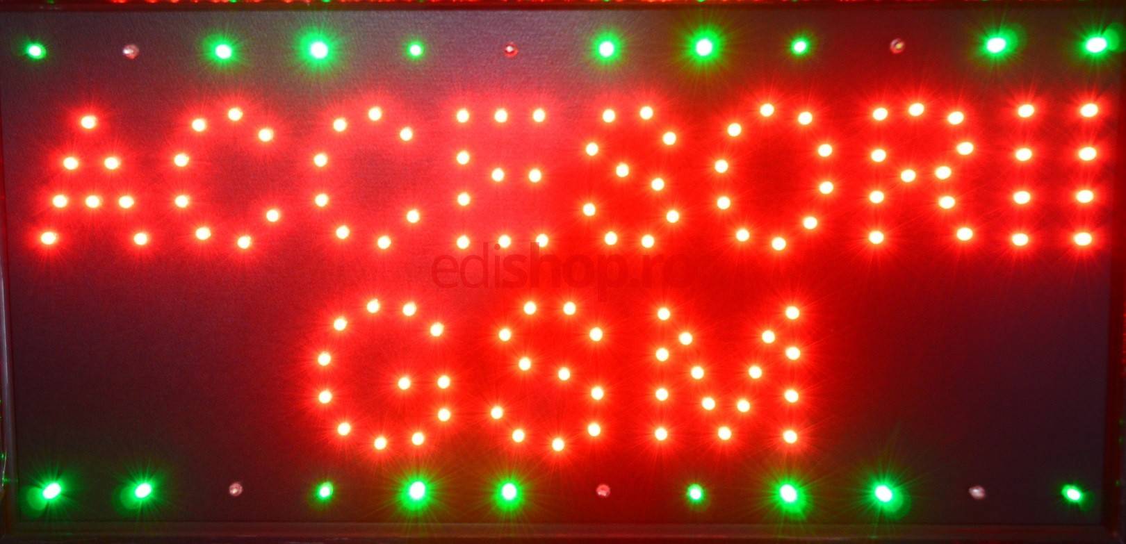 Reclama afiseaza mesajul - ACCESORII GSM - Reclama luminoasa dinamica cu efect de animatie prin aprinderea succesiva a ledurilor de pe margine. Pentru utilizare in interiorul cladirilor (la fereastra) Dimensiuni panou reclama: 48 x 25 cm Sistem de prindere inclus.